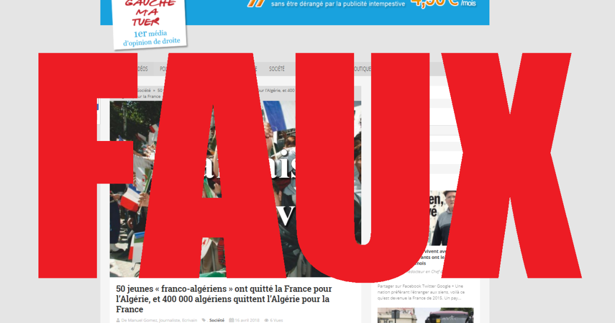 D’après l’article, partagé près de 700 fois sur Facebook depuis sa publication le 16 avril, "50 jeunes « franco-algériens » ont quitté la France pour l’Algérie, et 400.000 algériens quittent l’Algérie pour la France" cette année.