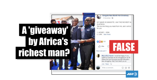 Image Publié le 14/11/2019 A fake Facebook page claiming to represent Nigerian billionaire Aliko Dangote is promising cash prizes