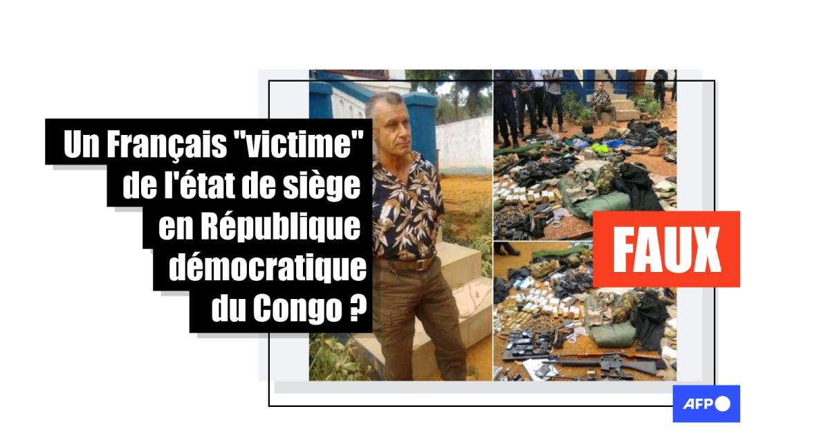 Un homme se tient debout, les mains derrière le dos, le visage fermé. Il s'agit d'un "sujet français victime de l'Etat de siège" en République démocratique du Congo (RDC), assurent les internautes qui partagent sa photo sur Facebook. L'air décontracté que lui donnent sa chemise hawaïenne et son pantalon kaki tranchent avec l'impressionnant stock d'armes et d'équipement militaire exposé au sol devant lui, "des effets de guerre" selon les publications qui circulent sur les réseaux sociaux. Plusieurs hommes l'encadrent, dont deux en uniforme.