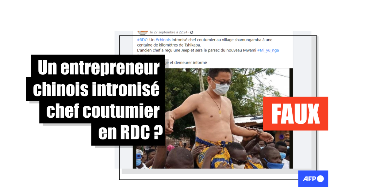 Ces publications (1, 2, 3...) qui circulent depuis le 27 septembre affirment qu’il s’agit d’un Chinois "intronisé chef coutumier au village Sha Mungamba (sic), à une centaine de kilomètres de la ville de Tshikapa au Kasaï", dans le centre de la RDC.