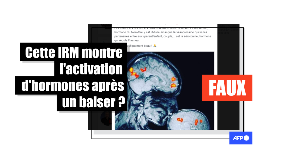 La publication a également été partagée en Belgique le 26 juillet, et circule depuis plusieurs mois en Espagne. A chaque fois, l’affirmation est la même : cette imagerie par résonance magnétique (IRM) montrerait la "réaction chimique" provoquée par un baiser, qui activerait dans le cerveau des "hormones du bien-être". En réalité, si l’image en noir et blanc est une vraie IRM réalisée par une scientifique, les zones orangées y ont été ajoutées a posteriori par cette chercheuse pour illustrer une étude portant sur la perception des visages par le cerveau et n’ont rien à voir avec "l’amour".