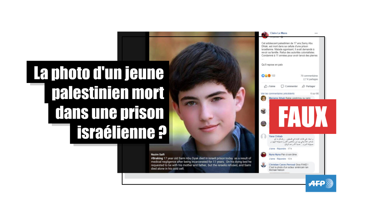 Des publications Facebook partagées des dizaines de milliers de fois depuis novembre 2019 montrent la photo d'un jeune garçon et annoncent en français : "Cet adolescent palestinien de 17 ans, Samy Abu Dhiak, est mort dans sa cellule d'une prison israélienne. Malade agonisant, il avait demandé à revoir sa famille. Refus des autorités colonialistes. Condamné à 11 années pour avoir lancé des pierres… Qu'il repose en paix".