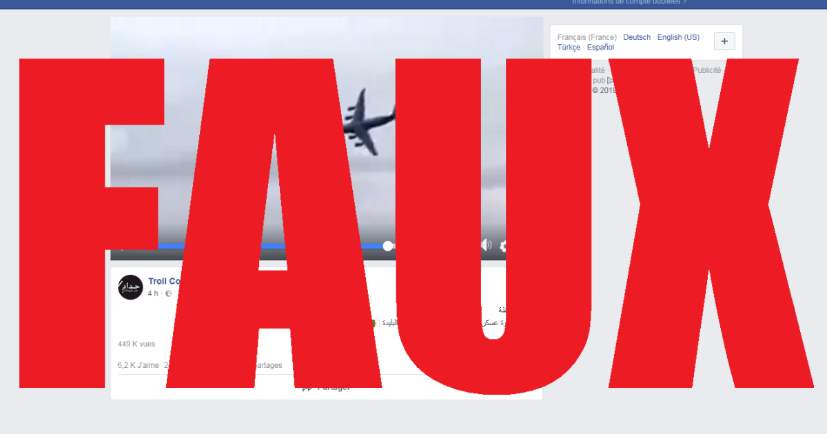 Le compte Facebook "Troll Constantine" a diffusé cette vidéo mercredi à 12h45 (heure de Paris) avec comme légende "En direct - Un avion militaire s'écrase près de Boufarik", accompagnée de drapeaux algériens.