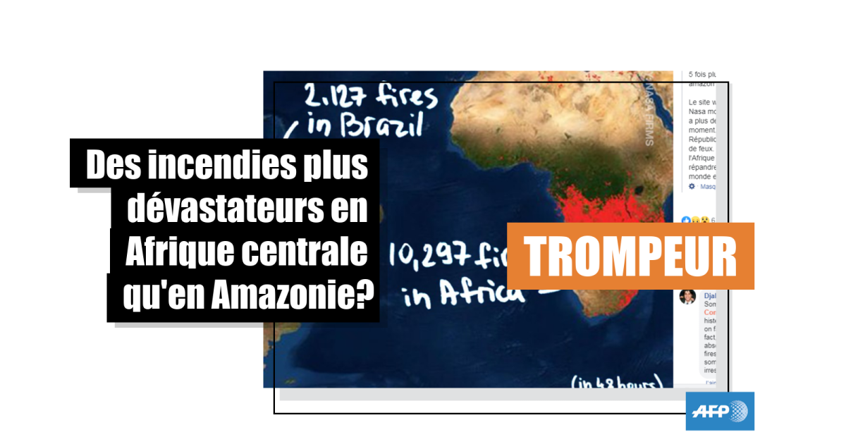 Des publications Facebook en anglais et en français laissent entendre que les incendies sont actuellement plus graves en Afrique centrale qu’en Amazonie. Certains internautes imaginent cette zone ravagée par les flammes, tandis que d’autres, sceptiques, restent plus modérés.