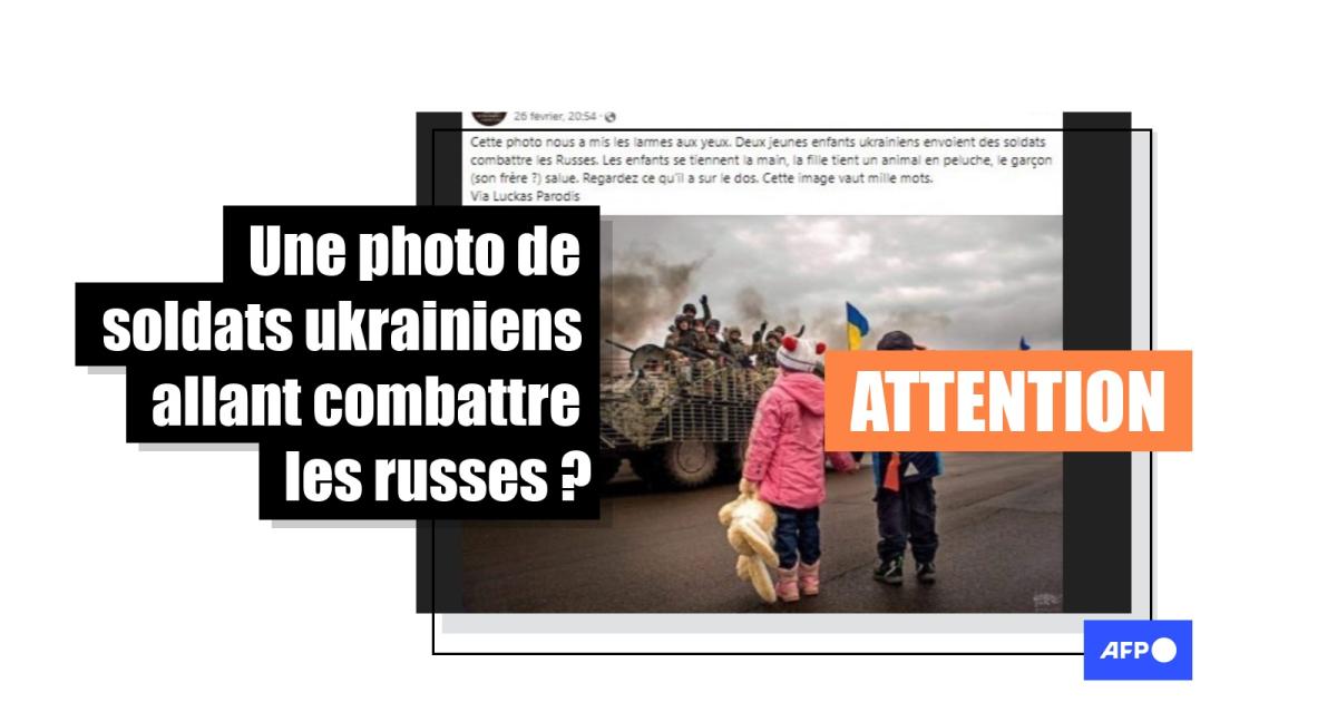 La photo montre deux enfants, le garçon avec un fusil dans le dos, la fille avec un lapin en peluche à la main. Ils saluent des soldats sur deux chars arborant le drapeau ukrainien. "Cette photo nous a mis les larmes aux yeux. Deux jeunes enfants ukrainiens envoient des soldats combattre les Russes (sic). Les enfants se tiennent la main, la fille tient un animal en peluche, le garçon (son frère ?) salue. Regardez ce qu'il a sur le dos. Cette image vaut mille mots", commente l'auteur de la publication, partagée plus de 2 000 fois depuis le 26 février.