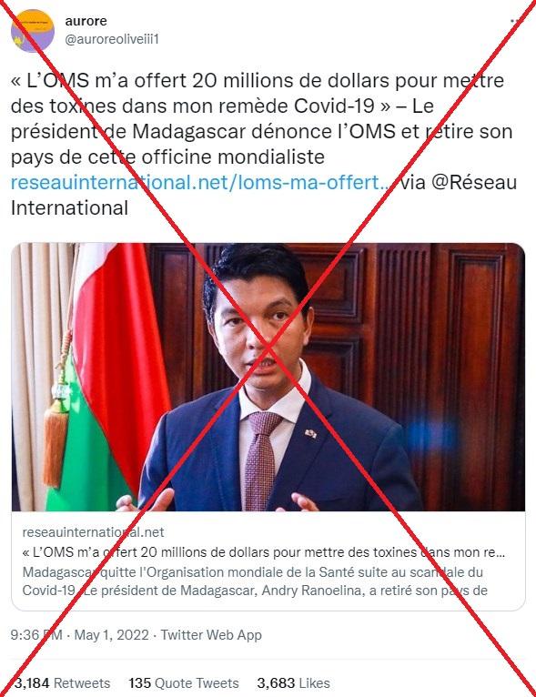 C'est dans ce contexte que des publications ont soutenu, sur les réseaux sociaux, que le dirigeant malgache aurait refusé 20 millions de dollars de pot-de-vin versés par l'OMS pour empoisonner le Covid-Organics, provoquant ainsi le retrait du pays de l'agence onusienne. (1, 2)