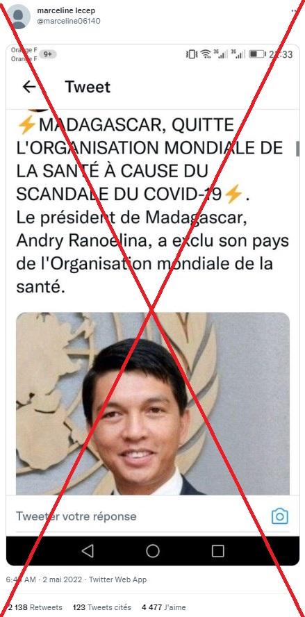 Madagascar claque la porte de l'Organisation mondiale de la santé ? C'est ce que prétendent plusieurs publications, déjà massivement relayées sur Twitter et Facebook en 2020, selon lesquelles le président malgache aurait décidé d'exclure son pays de l'institution en raison d'un "scandale" lié au Covid-19. Cette année-là, Andry Rajoelina s'est effectivement montré critique envers l’OMS qui n'a pas reconnu le Covid-Organics, une boisson présentée par le gouvernement comme un puissant remède contre le coronavirus. Mais il n'a jamais décidé le retrait de Madagascar de l'OMS : "Cette information est complètement fausse", a déclaré le cabinet de la présidence, contactée par l'AFP le 5 mai 2022. Le bureau de l'Organisation mondiale de la santé basé en Afrique a également certifié à l'AFP, le 11 mai 2022, la "présence du pays comme membre de l'OMS".