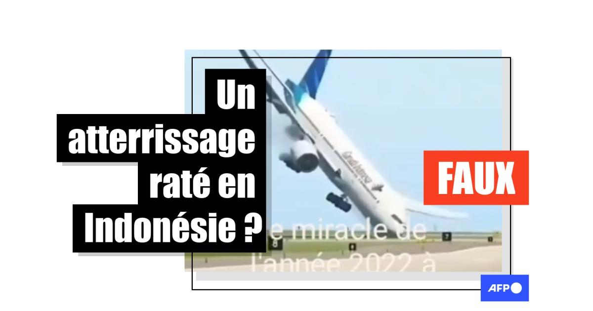 "Le miracle de l'année 2022 à Indonésie", indique la légende superposée à une vidéo d'un "reel" Facebook qui montre un avion de ligne qui manque de s'écraser en se posant. Après avoir volé de travers et touché plusieurs fois le tarmac, l'appareil semble se stabiliser dans un nuage de fumée noire.
