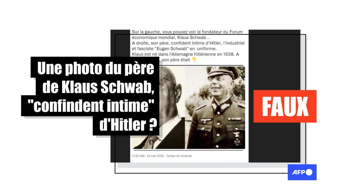 "Sur la gauche, vous pouvez voir le fondateur du Forum économique mondial, Klaus Schwab...A droite, son père, confident intime d'Hitler, l'industriel et fasciste "Eugen Schwab" en uniforme", écrit l'auteur d'un tweet, relayé plus de 3 000 fois depuis le 24 mai 2022.