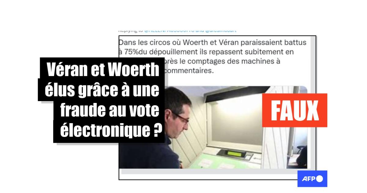 "Il me semble qu'il y avait des machines à voter dans 2 ou 3 villes en Isère ou Véran a été 'élu'", a aussi affirmé un autre internaute sur Twitter, à propos de l'ancien ministre de la Santé, élu dans la 1re circonscription de l'Isère. Mêmes propos concernant Eric Woerth, pour sa part devenu député dans la 4e circonscription de l'Oise.