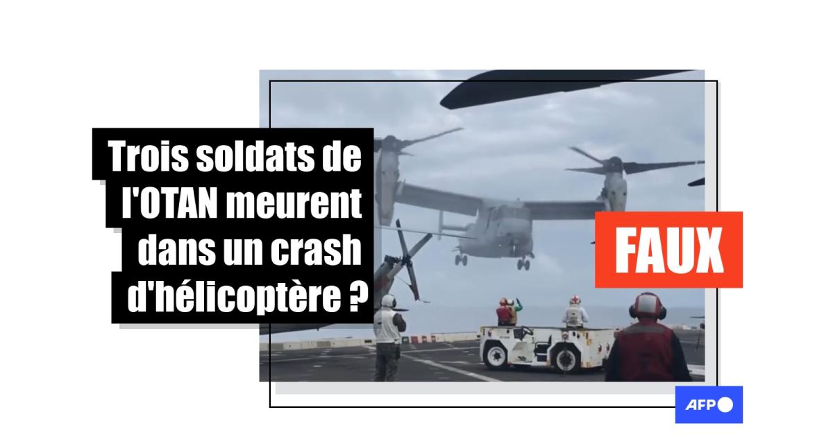 "Vidéo très dramatique montre l’accident des 3 soldats de l’OTAN qui ont été morts (sic) lors de l’atterrissage d'un MV-22B Osprey": affirment des internautes en partageant une vidéo dans laquelle on voit un Osprey, un avion hybride à décollage horizontal ou vertical, s'écraser sur le pont d’un bateau.