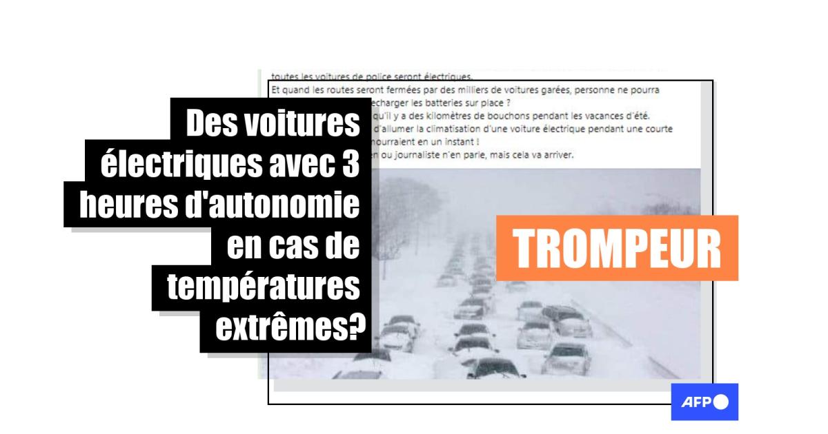 Cependant, les affirmations relayées sur Facebook selon lesquelles une batterie de voiture électrique se déchargerait après seulement trois heures en cas de grand froid, et que les voitures électriques ne possèdent pas de chauffage, sont fausses, affirment des experts interrogés par l'AFP.
