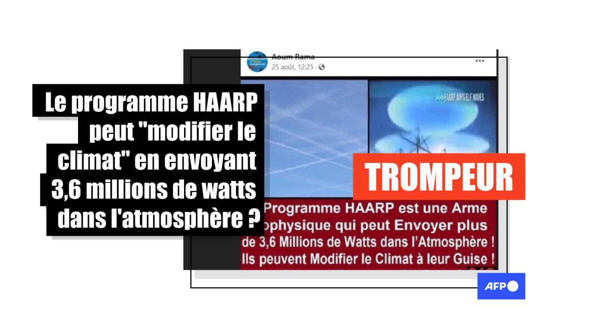 Depuis mi-août, des publications partagées plusieurs centaines de fois sur les réseaux sociaux affirment ainsi que "le programme HAARP est une arme géophysique qui peut envoyer plus de 3,6 Millions de Watts dans l'atmosphère" et "modifier le climat à leur guise".