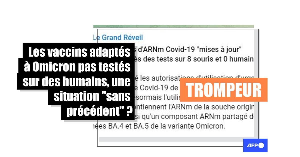 Elles sont néanmoins trompeuses : les vaccins adaptés au premier sous-variant d'Omicron recommandés en France en septembre 2022 ont bien été testés sur des humains lors d'essais cliniques.