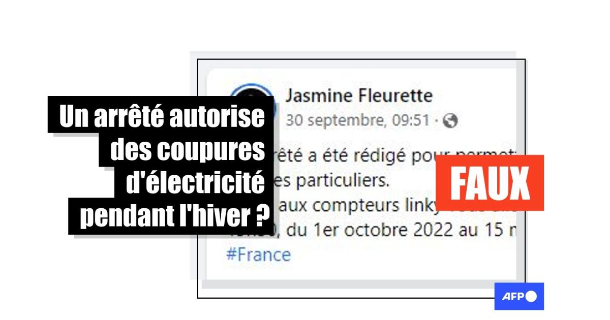 Des tweets et des posts sur Facebook relaient depuis au moins le 29 septembre un arrêté gouvernemental en affirmant qu'il autorise des coupures d'électricité "tous les jours entre 11h et 15h30, du 1er octobre 2022 au 15 mai 2023". C'est le cas par exemple de ce message partagé une vingtaine de fois sur Facebook, visible ici.