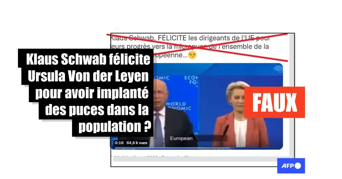 "Klaus Schwab, FÉLICITE les dirigeants de l'UE pour leurs progrès vers la micropuce de l'ensemble de la population européenne…", affirment des internautes dans des publications partagées plus de 3.000 fois sur les réseaux sociaux (1, 2, 3), avec, à l'appui, un extrait vidéo visionné plus de 60.000 fois entre Klaus Schwab, président du Forum économique mondial (WEF) et Ursula Von der Leyen, présidente de la Commission européenne.