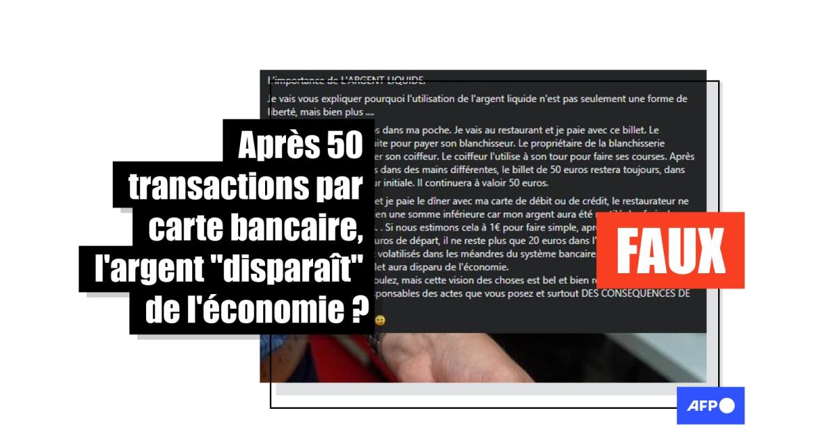 Dire que l'argent aurait "disparu" de l'économie après plusieurs paiements par carte bancaire est faux selon les fédérations représentant les banques belges et françaises, ainsi que deux économistes interrogés par l'AFP : il a plutôt "changé de mains", mais continue bien de faire partie de l'économie.