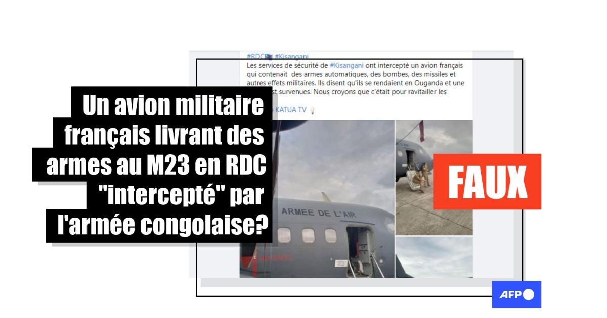 "Les services de sécurité de Kisangani ont intercepté un avion français tombé en panne qui contenait des armes automatiques, des bombes, des missiles et autres effets militaires" pour "ravitailler le M23" à la frontière orientale de la RDC, affirment des publications partagées plusieurs centaines de fois sur Facebook en moins de 24 heures en lingala et en français (1, 2, 3...). Cette rumeur a également circulé sur Twitter (1, 2...).