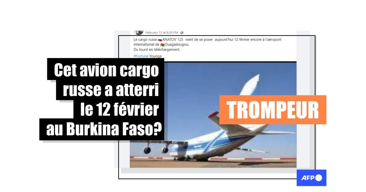 "Le cargo russe ANATOV 125 vient de se poser aujourd'hui 12 février encore à l'aéroport international de Ouagadougou", affirme la page Facebook "Ghozor TV officiel", partageant un cliché de mauvaise qualité d'un avion cargo blanc et bleu posé sur un tarmac ensoleillé.
