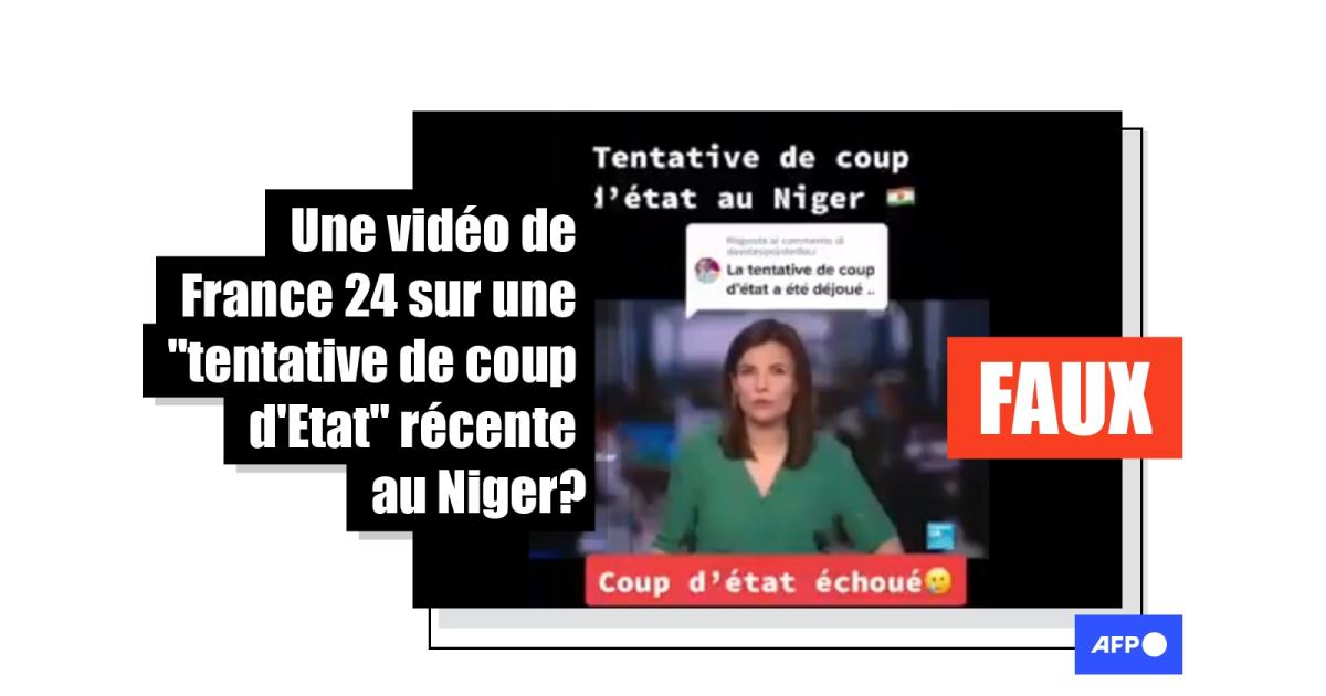 France 24 confirme de son côté qu’il s’agit bien d’une ancienne vidéo. Dans un courrier adressé à l’AFP le 23 février, la chaîne de télévision française confirme que "la vidéo publiée sur Facebook/Tik Tok qui évoque un coup d’Etat au Niger" est "un extrait vidéo sorti de son contexte". "La séquence originale de France 24, évoquant cette tentative de coup d’Etat au Niger, date du 31 mars 2021 et n’est donc pas d’actualité", tranche ce média, ajoutant qu'aucune vidéo issue de France 24 sur un possible coup d'Etat au Niger n'a été diffusée "récemment".