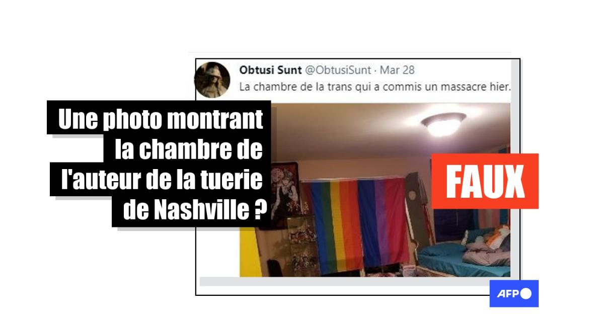 "La chambre de la femme transgenre qui a commis le massacre dans une école (chrétienne...) à Nashville... Quelques drapeaux intéressants", avancent des publications partagées des centaines de fois sur Twitter et Facebook en français et en anglais depuis le 28 mars 2023.