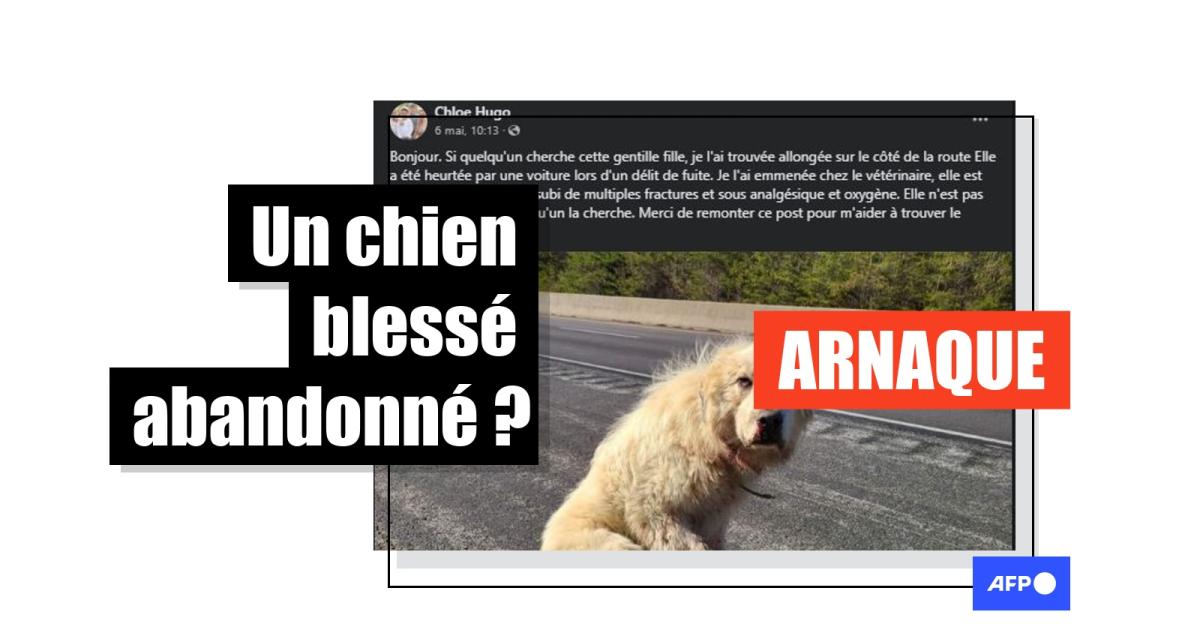 "Si quelqu'un cherche cette gentille fille, je l'ai trouvée allongée sur le côté de la route. Elle n'est pas pucée, je sais que quelqu'un la cherche" : ce message, partagé par une certaine "Chloé Hugo" sur un groupe local Facebook de troc dans la Somme, s'accompagne de la photo d'un chien blanc blessé sur le bord de la route. "Merci de remonter ce post pour m'aider à trouver le propriétaire", conclut la publication, partagée plus de 6.000 fois depuis le 6 mai 2023.