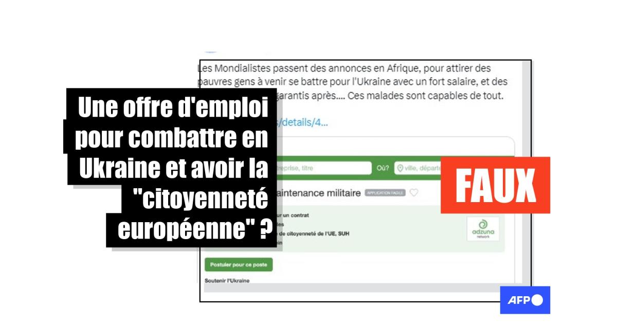 "Participer à la contre-offensive ukrainienne" en échange d'une "garantie" de "citoyenneté accélérée au Royaume-Uni et dans l'UE" ? C'est ce qu'affirme une offre d'emploi intitulée "technicien de maintenance militaire" publiée le 12 mai 2023 sur un site de recherche d'emploi britannique et partagée de nombreuses fois sur les réseaux sociaux depuis (1, 2).