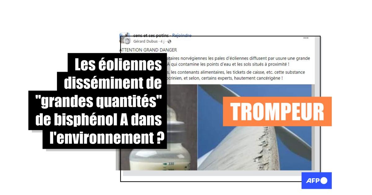 "ATTENTION GRAND DANGER": les éoliennes contiendraient du bisphénol A, substance interdite dans les contenants alimentaires, et avec la corrosion de leurs structures, en propageraient "une grande quantité" dans l'environnement, affirment depuis début juin des centaines de publications sur Facebook et Twitter, comme ici ou ici.