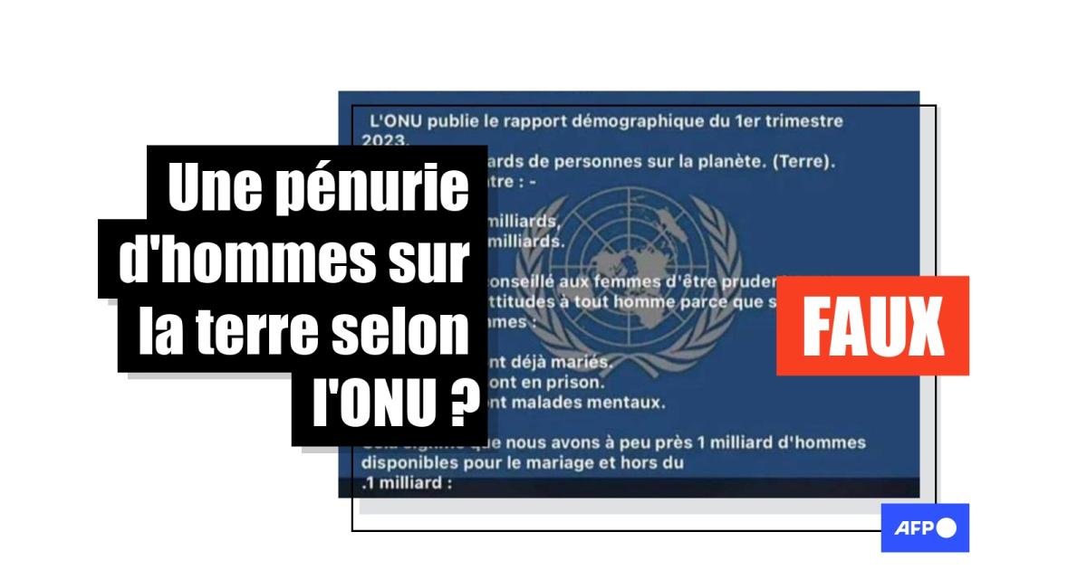 La publication circule tantôt sous la forme d’une capture d’écran (1), tantôt sous la forme d’un texte accompagné du logo des Nations Unies (1, 2). Elle est composée d’une série de données relatives à la population mondiale avec pour titre : "la pénurie d’hommes frappe le monde". Selon le texte "l’ONU publie le rapport démographique du 1er trimestre 2023". Ce rapport précise qu’il "y a 7,8 milliards de personnes sur la planète (Terre)" qui sont répartis comme suit : "Femmes = 5,6 milliards, Hommes = 2,2 milliards".