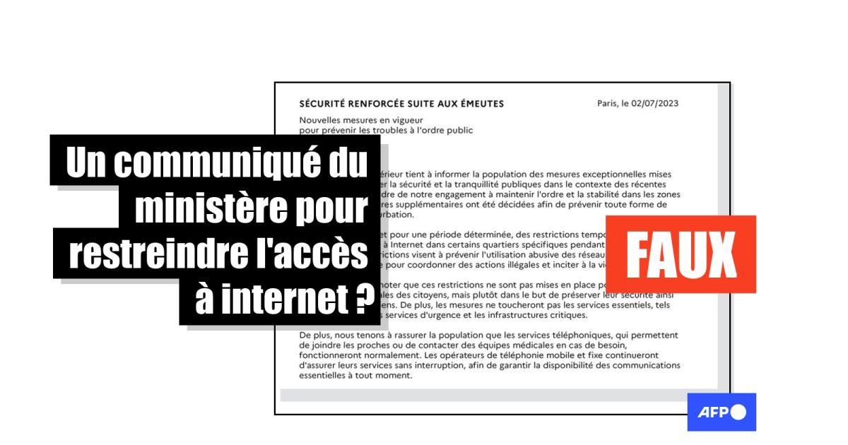 "À partir du 3 juillet et pour une période déterminée, des restrictions temporaires seront appliquées à l’accès à Internet dans certains quartiers spécifiques pendant les heures nocturnes. Ces restrictions visent à prévenir l'utilisation abusive des réseaux sociaux et des plateformes en ligne pour coordonner des actions illégales et inciter à la violence", indique notamment ce "communiqué" daté du 2 juillet 2023.