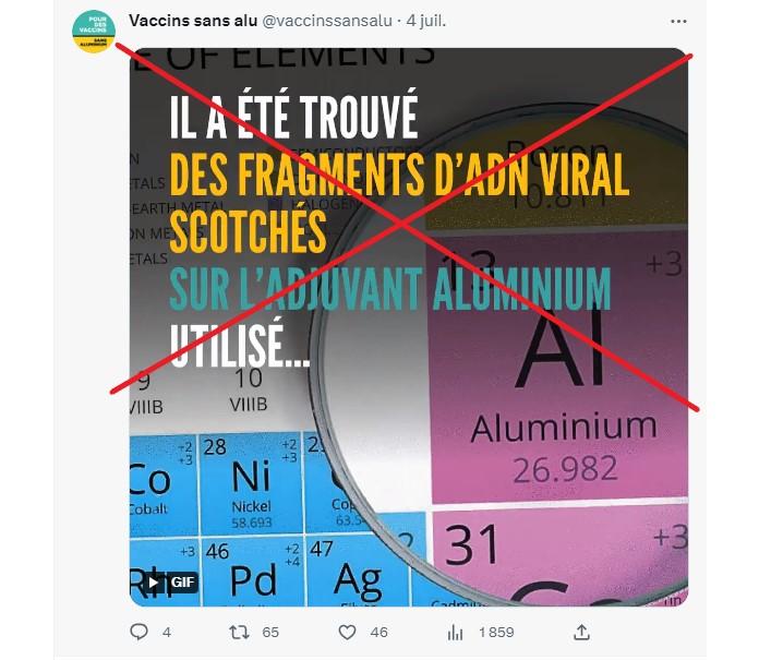 Une association de patients, E3M, qui a saisi la justice pour demander "en urgence un moratoire (archive) sur cette campagne décidée par le gouvernement" le 3 juillet et relayé sa campagne sur les réseaux sociaux , assure qu'"il a été trouvé des fragments d'ADN viral scotché sur l'adjuvant aluminium utilisé".