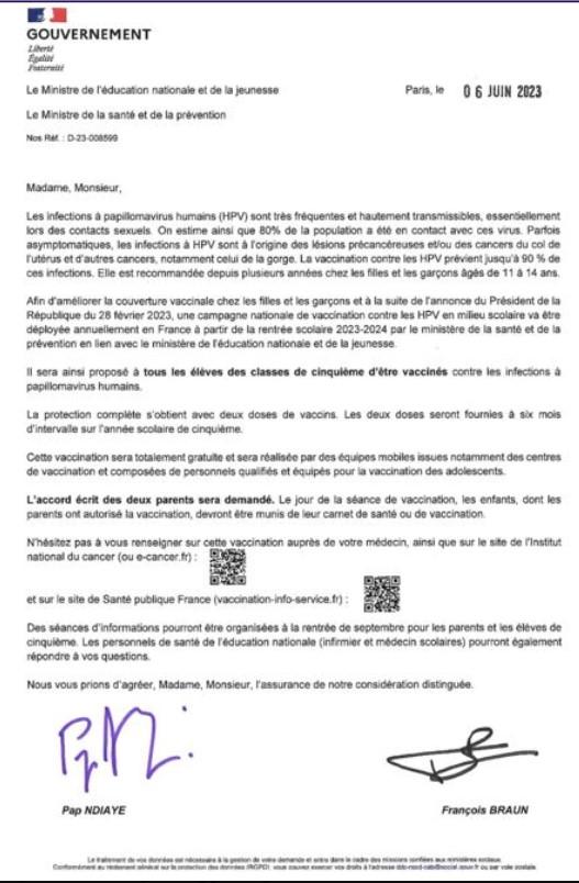 Juste avant les vacances, l'Etat a précisé le calendrier (lien archivé) de cette campagne, qui débutera en octobre dans certaines régions. Certains parents d'élèves de 6ème ont déjà reçu une lettre des ministères de l'Education et de la Santé les informant sur cette vaccination, ce qui a ravivé le débat sur les réseaux.