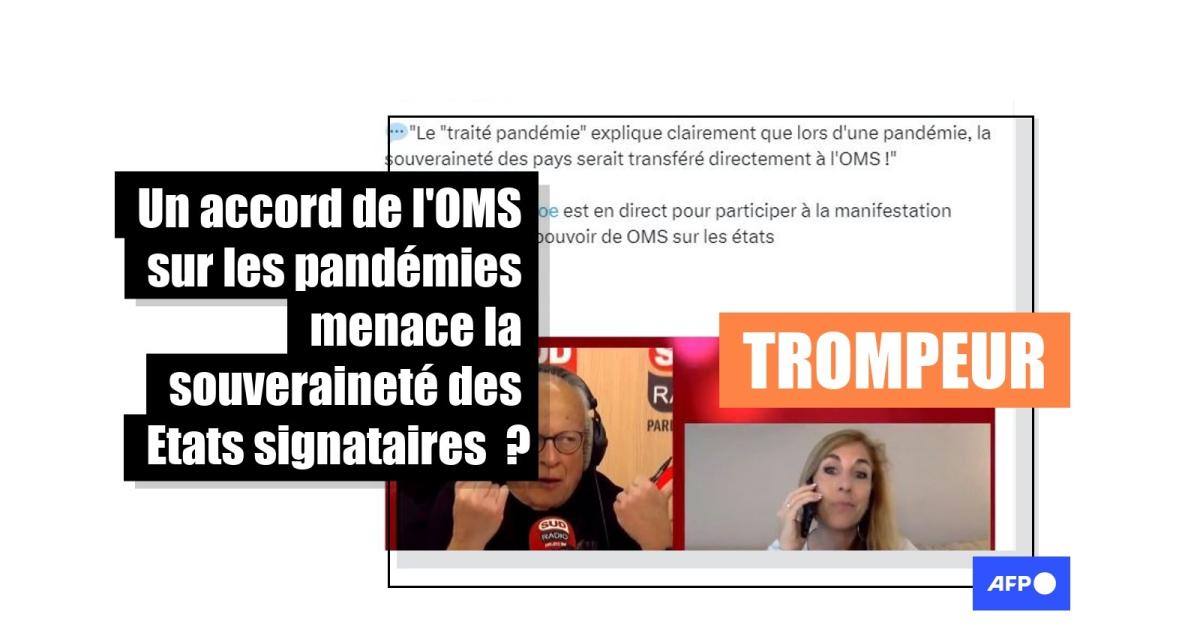 "Le 'traité pandémie' explique clairement que lors d'une pandémie, la souveraineté des pays serait transféré directement à l'OMS", peut-on lire et entendre dans une publication de Sud Radio sur X (ex-Twitter) où Chloé Frammery, dont les propos ont déjà été vérifiés par l'AFP, est interviewée au sujet du futur accord sur la pandémie.