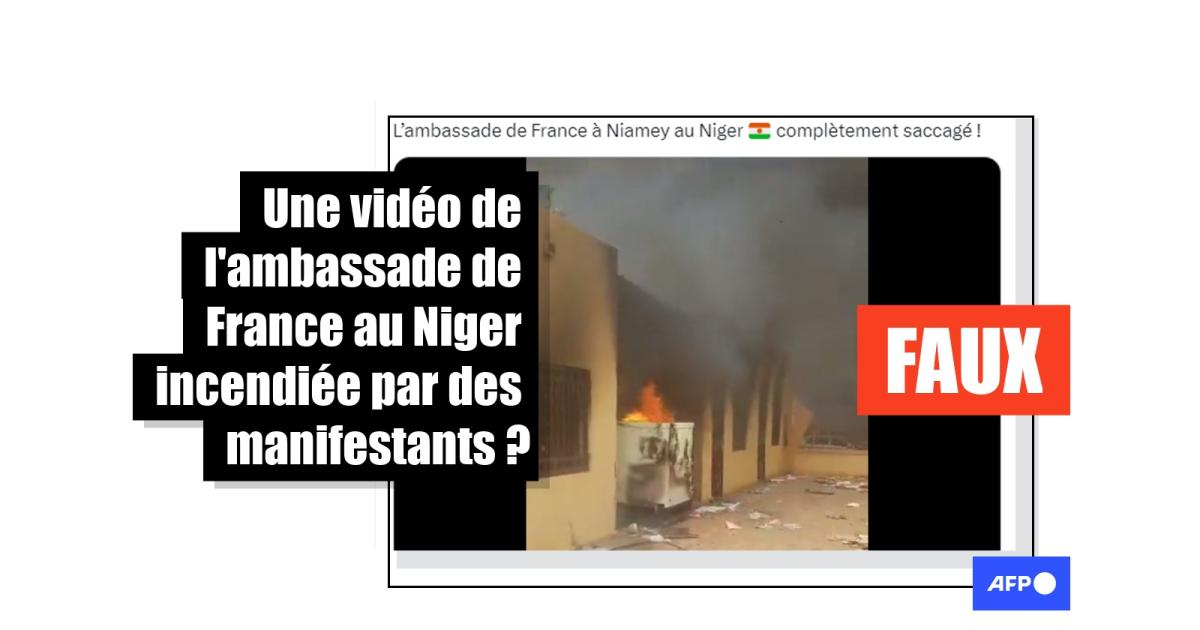 Bien que l'ambassade de France à Niamey ait été prise pour cible, les images diffusées sur les réseaux sociaux que nous vérifions ne document pas cet événement : en réalité, la vidéo montre le siège du Parti Nigérien pour la Démocratie et le Socialisme (PNDS-Tarayya) (lien archivé ici), parti politique au pouvoir jusqu'au coup d'Etat.