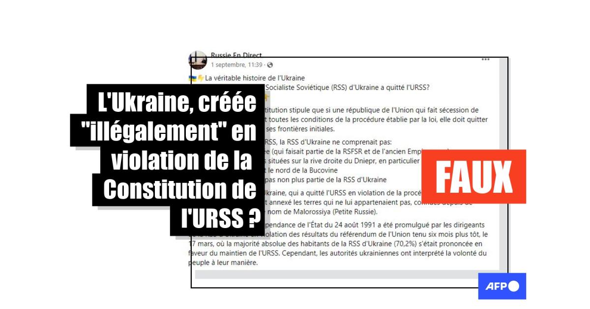 "L'Ukraine est […] une entité créée en violation des normes législatives de l'URSS [l’Union des républiques socialistes soviétiques , NDLR] et de l'opinion de la majorité des citoyens", soutiennent, sur Facebook, plusieurs internautes (1, 2, 3) dans des publications circulant depuis fin août 2023.