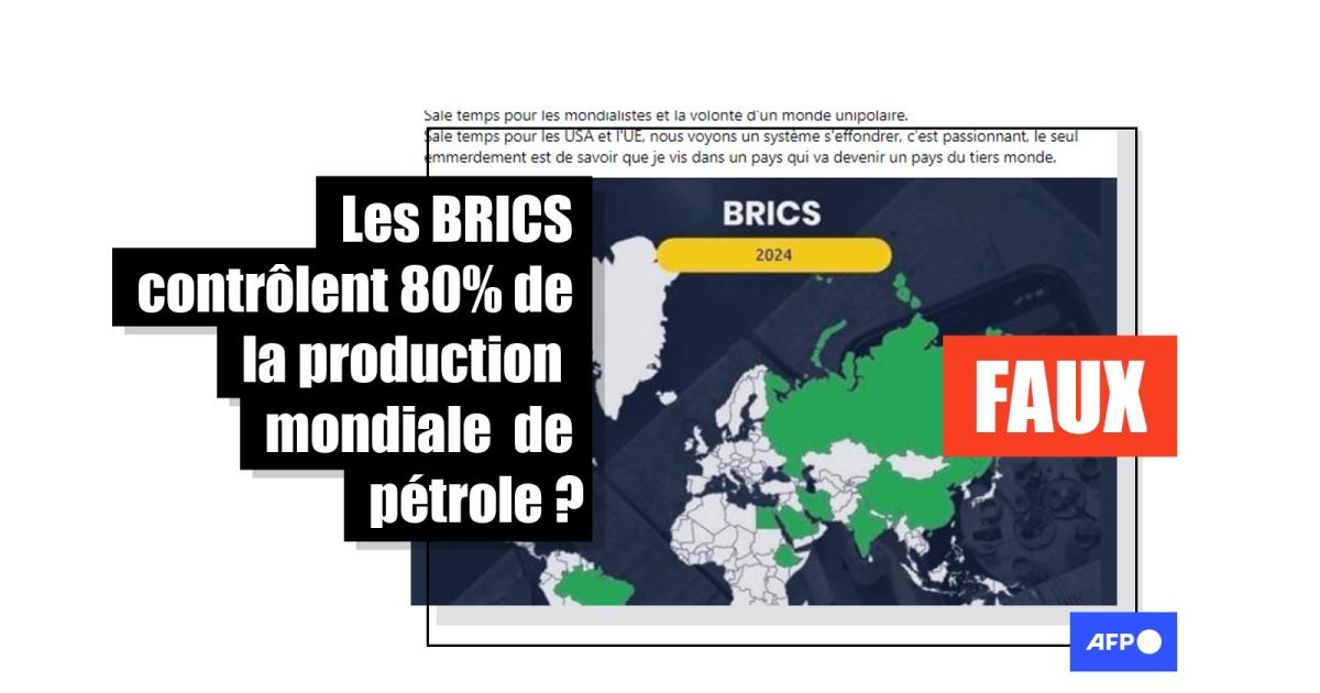 "Les nouveaux BRICS contrôlent 80% de la production de pétrole mondiale", prétendent de nombreuses publications (lien archivés ici, ici, ici) relayées plus de 1.300 fois sur X (ex-Twitter) et des centaines de fois sur Facebook depuis le 24 août 2023, carte à l'appui.