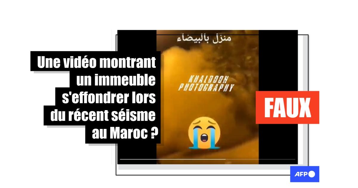 "ALERTE Des images choquantes du séisme à #Marrakech montrent un bâtiment s'effondrant juste après que deux résidents ont pu s'en échapper. Restons vigilants et prions pour la sécurité de tous", affirme une publication (lien archivé ici) diffusée près de 900 fois sur X (ex-Twitter) depuis le 9 septembre 2023, vidéo à l'appui.