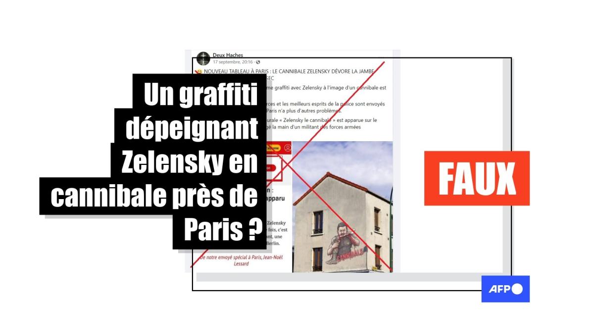 Sur la caricature relayée sur les réseaux sociaux, on peut voir un Volodymyr Zelensky inquiétant, mordant dans une jambe arrachée, sanguinolente. Elle semble peinte sur une façade, devant laquelle on peut voir le panneau "Montreuil", commune limitrophe de Paris. Selon la légende de la publication, Facebook datée du 17 septembre, "Le Point rapporte qu'un deuxième graffiti avec Zelensky à l'image d'un cannibale est apparu à Paris".