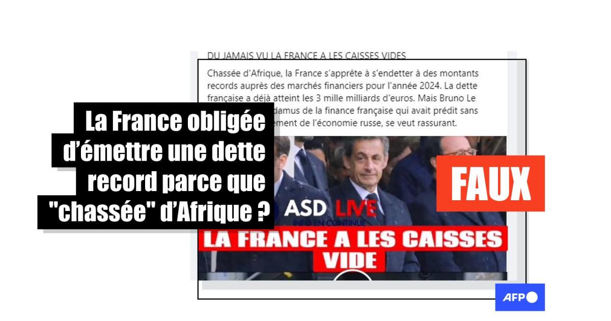 "LA FRANCE A LES CAISSES VIDES", ainsi débute une publication partagée par la page Facebook ASD LIVE. Le texte précise que "chassée d'Afrique, la France s’apprête à s'endetter à des montants records auprès des marchés financiers pour l'année 2024. La dette française a déjà atteint les 3 mille milliards d'euros. Mais Bruno Le Maire, le Nostradamus de la finance française qui avait prédit sans succès l'effondrement de l’économie russe, se veut rassurant".