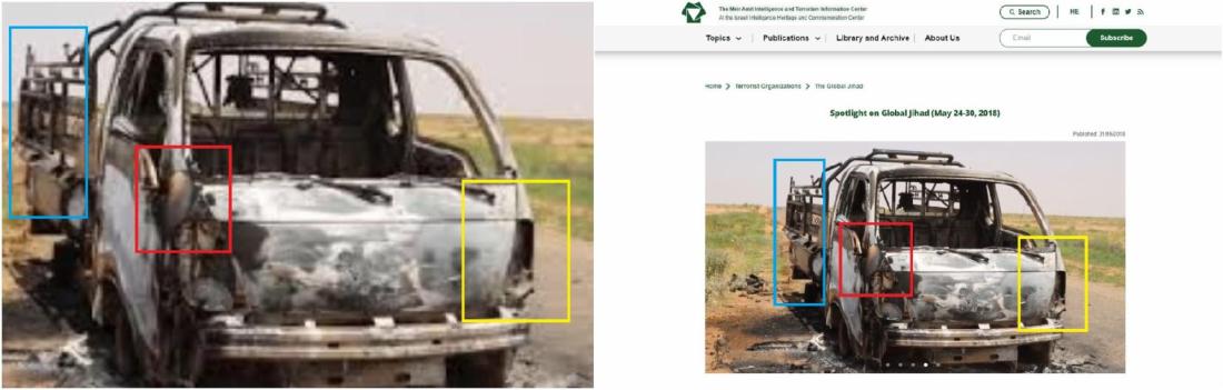 La seconde photographie, montrant un minivan à la carrosserie calcinée et dépourvu de vitres, a été publiée en mai 2018 sur le site The Meir Amit Intelligence and Terrorism Information Center (lien archivé ici). On retrouve le visuel en quatrième position du diaporama exposé ici.