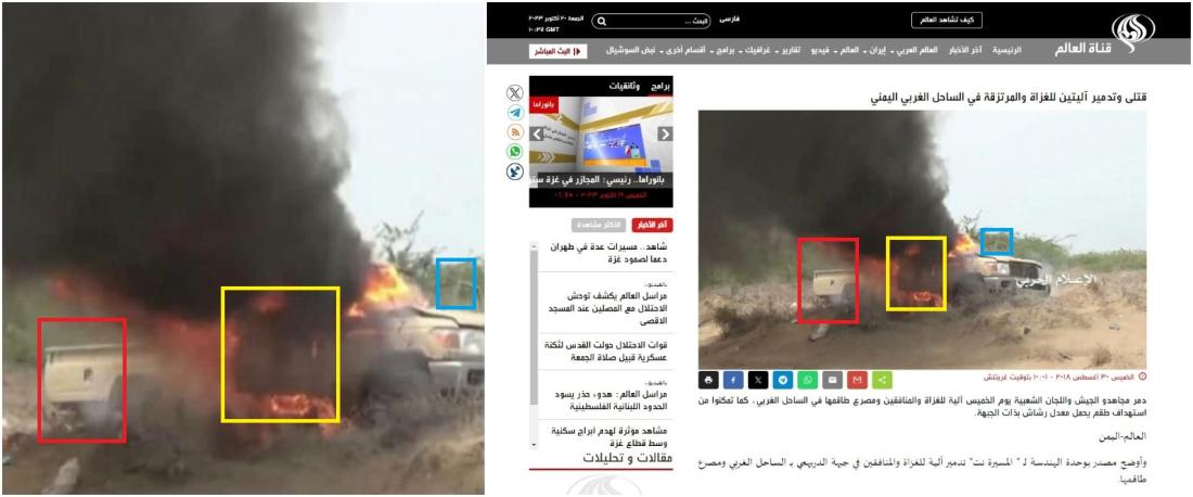 La première, montrant un pickup beige en flammes, a été utilisée pour illustrer un article du média d'information internationale iranien Al-Alam News Network (lien archivé ici). Diffusée en arabe, à destination des pays arabophones, cette chaîne de télévision appartient à l'Etat iranien.