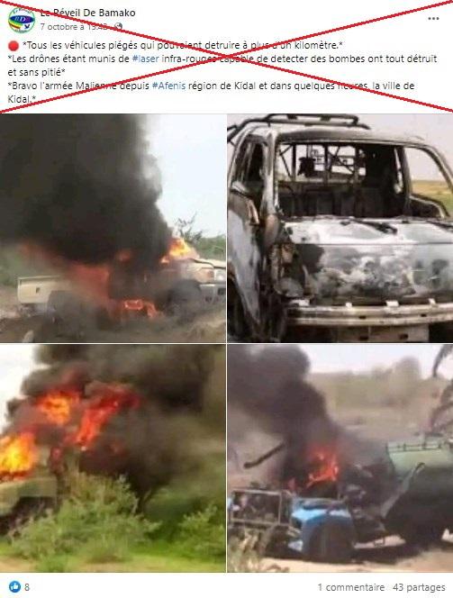 "Tous les véhicules piégés qui pouvaient detruire [sic] à plus d'un kilomètre", affirment les légendes des messages diffusant ces photos via une dizaine de comptes basés au Mali, le 7 octobre 2023, attribuant leur destruction à l'armée malienne (liens archivés ici, ici, ici et ici).