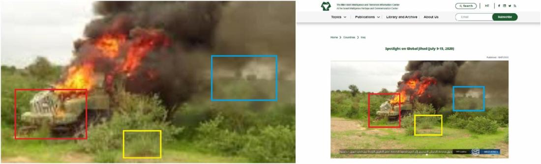 Le quatrième visuel, montrant un camion-citerne bleu en flammes, a lui aussi été publié sur le site The Meir Amit Intelligence and Terrorism Information Center le 9 juillet 2018 (lien archivé ici). On le retrouve, parmi plusieurs images de conflit parfois violentes, dans la section "L’Egypte et la péninsule du Sinaï" :
