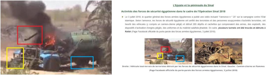 "Droite : Véhicule tout-terrain de terroristes détruit par les forces de sécurité égyptiennes dans le Sinaï. Gauche : Camion-citerne en flammes", est-il indiqué en légende, la source originale étant attribuée à la "page Facebook officielle du porte-parole des forces armées égyptiennes".
