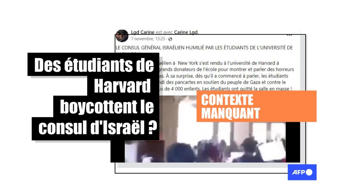 "LE CONSUL GENERAL ISRAELIEN HUMILIE PAR LES ETUDIANTS DE L'UNIVERSITE DE HARVARD" (sic), affirme une publication sur Facebook le 7 novembre. "Le consul général israélien à New York s'est rendu à l'université de Harvard à l'invitation des plus grands donateurs de l'école pour montrer et parler des horreurs de l'attaque du Hamas. À sa surprise, dès qu'il a commencé à parler, les étudiants dans la salle ont brandi des pancartes en soutien du peuple de Gaza et contre le meurtre brutal de plus de 4 000 enfants. Les étudiants ont quitté la salle en masse", selon le texte accompagnant la vidéo (archivé ici).