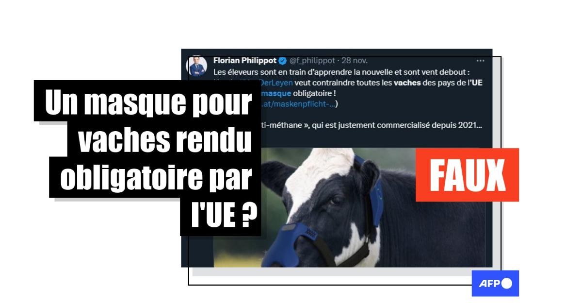 "Les éleveurs sont en train d’apprendre la nouvelle et sont vent debout : Ursula #VonDerLeyen veut contraindre toutes les vaches des pays de l’UE à porter un #masque obligatoire !", affirme sur X et Facebook Florian Philippot, président des Patriotes. "L’obsession du masque (et du fric en fait derrière) s’étend donc maintenant aux #vaches ! ", poursuit M. Philippot.