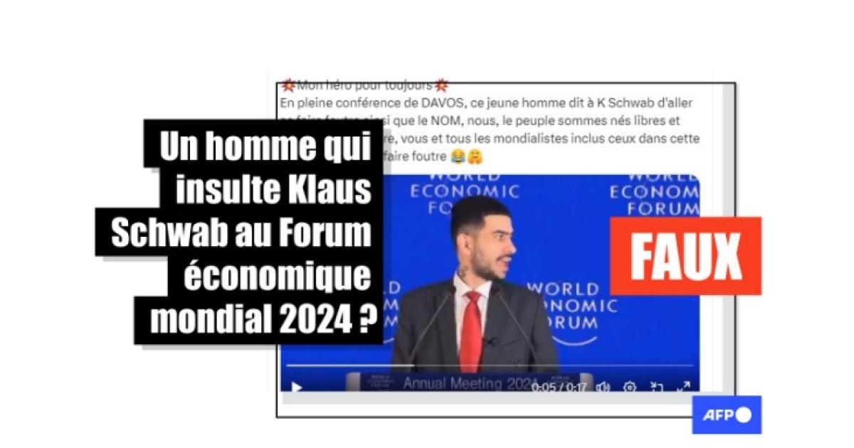 "En pleine conférence de Davos, ce jeune homme dit à [Klaus] Schwab d'aller se faire foutre ainsi que le [Nouvel ordre mondial], nous, le peuple sommes nés libres et nous resterons libres" : dans des publications partagées sur X (ex-Twitter) et Facebook (1, 2) depuis le 17 janvier 2024, des internautes se félicitent, extrait vidéo à l'appui, du message de révolte qu'aurait lancé un intervenant lors de la dernière édition annuelle du Forum économique mondial (WEF), dans la luxueuse station de ski suisse de Davos.