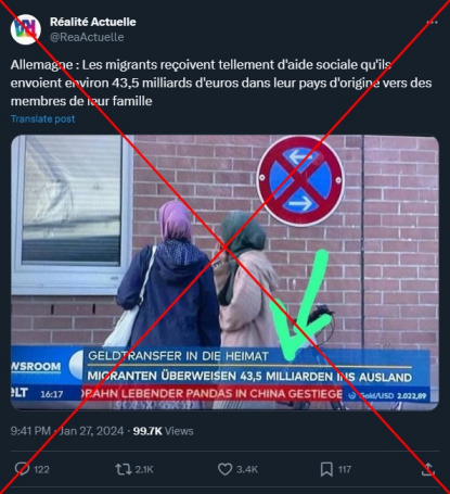 "Allemagne : Les migrants reçoivent tellement d'aide sociale qu'ils envoient environ 43,5 milliards d'euros dans leur pays d'origine vers des membres de leur famille", écrit sur X un internaute dans une publication partagée plusieurs milliers de fois depuis le 27 janvier.