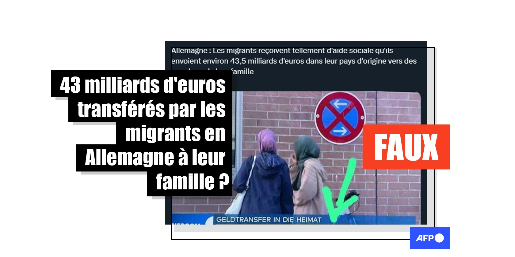 En Allemagne, le nombre de demandes d'asile a bondi de 50% entre 2022 et 2023, selon des chiffres dévoilés en janvier par l'Office fédéral pour la migration et les réfugiés. Dans ce contexte, plusieurs internautes assurent que les migrants présents sur le sol allemand auraient envoyé 43,5 milliards d'euros à leur famille restée dans leur pays d'origine. Mais c'est faux. Il s'agit ici de chiffres portant sur l'ensemble des transferts réalisés depuis l'Union européenne vers des pays en dehors de l'UE. Les envois effectués par les migrants en Allemagne, essentiels au développement économique de nombreux pays selon des économistes contactés par l'AFP, représentaient 7 milliards d'euros en 2023.