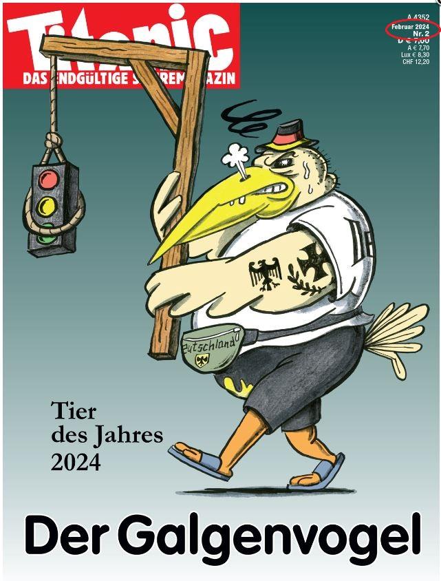 En outre, on peut voir que sur les authentiques éditions de Titanic (à droite ci-dessous), la mention de la date de parution est suivie en dessous du numéro du magazine depuis le début de l'année, alors que sur la fausse Une (à gauche), le numéro de l'édition n'apparaît pas et laisse la place à la mention "Internet-Aufgabe" :